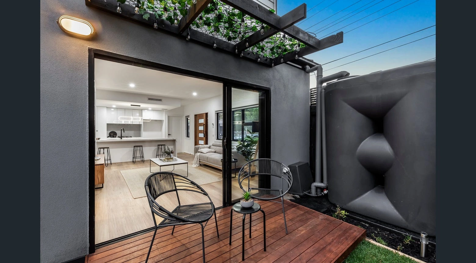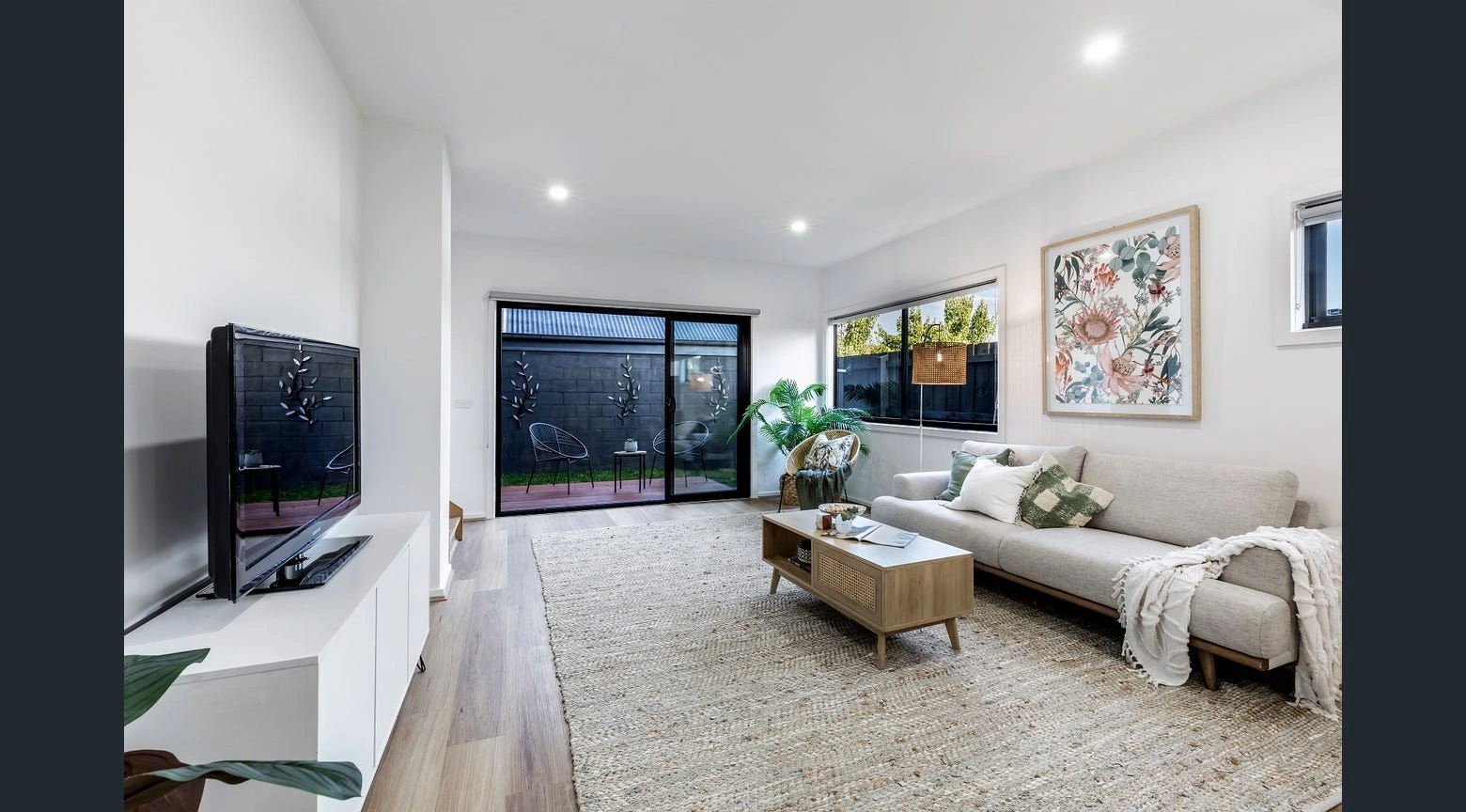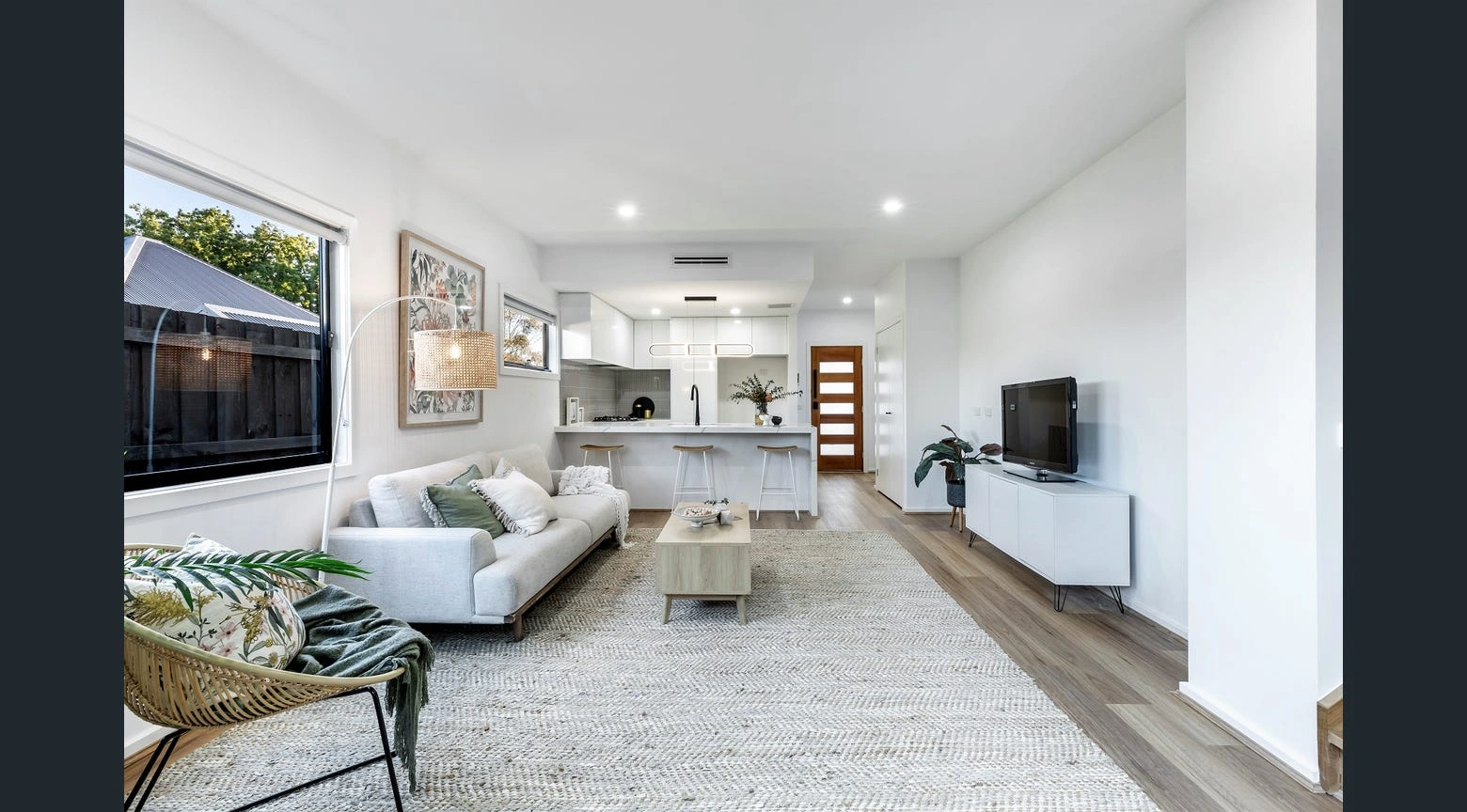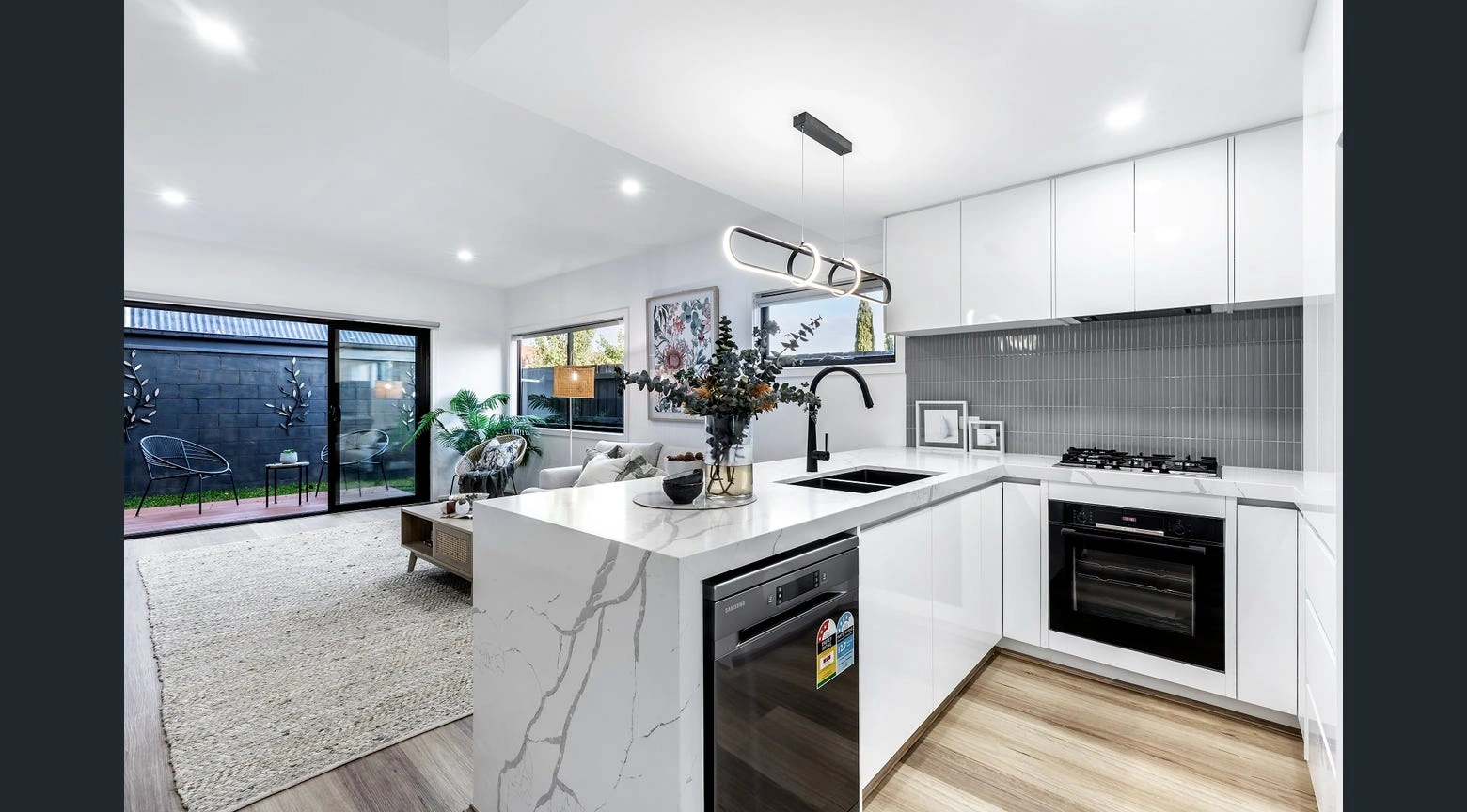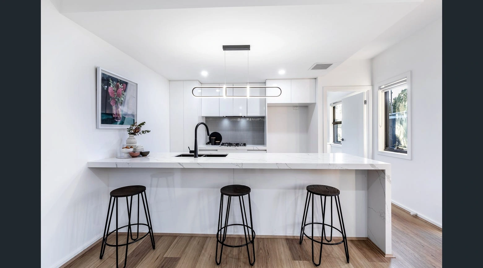 Step inside and discover a light-filled sanctuary where contemporary architecture meets superior craftsmanship. The open-plan living and dining areas feature engineered timber floors, square-set cornices, and high ceilings, offering an airy, sophisticated atmosphere. The gourmet kitchen is a showpiece in its own right, complete with 60mm Calacatta stone benchtops with waterfall edges, an undermount sink, matte black tapware, and premium appliances – all chosen to meet the demands of everyday cooking with the finesse of a designer space.